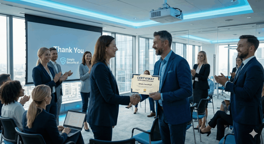Każdy uczestnik szkolenia otrzymuje imienny certyfikat ukończenia kursu Simply Security, potwierdzający podniesienie kwalifikacji w zakresie bezpieczeństwa informacji.